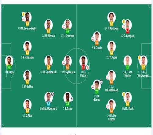 1-拉亞、49-斯凱利(71’6-加布里埃爾)、2-薩利巴、5-因卡皮耶、36-蘇維門迪、41-賴斯、23-梅里諾、8-厄德高、7-薩卡、19-特羅薩德(83’11-馬丁內(nèi)利)、14-約克雷斯(71’9-熱蘇斯)。