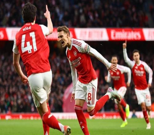比賽剛開(kāi)始不久,哲凱賴什獲得非常好的機(jī)會(huì),他在禁區(qū)前沿的一腳凌空射門(mén)沒(méi)有打上力量。門(mén)將倒地把球撲住。隨后,薩卡突入禁區(qū)右側(cè),小角度射門(mén),被擋了出去。第14分鐘,阿森納進(jìn)球了!厄德高在禁區(qū)前沿起腳遠(yuǎn)射,皮球鉆入球門(mén)近角!這是厄德高本賽季的首粒進(jìn)球!