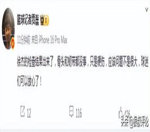 根據(jù)籃球記者賈磊爆料,徐杰的檢查結(jié)果出來(lái)了,骨頭和韌帶都沒事,只是硬傷,應(yīng)該問(wèn)題不是很大,球迷們可以放心了。