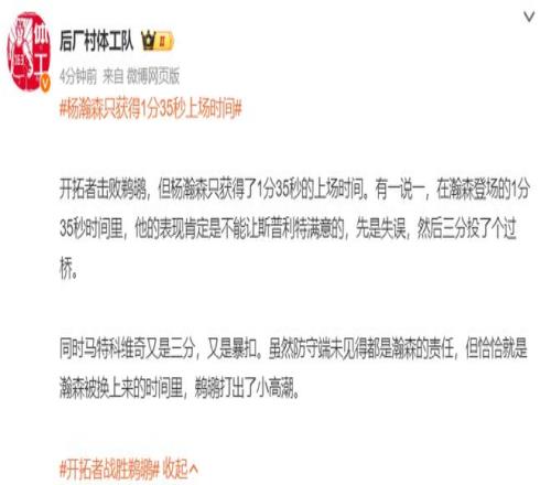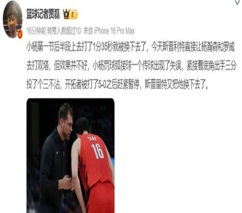 后廠村體工隊評價:楊瀚森只打1分35秒,有一說一他登場的時間是無法讓斯普利特滿意的,先是失誤然后投了一個三分過橋,瑪特科維奇又是三分又是暴扣,楊瀚森一上來鵜鶘就一波小高潮。