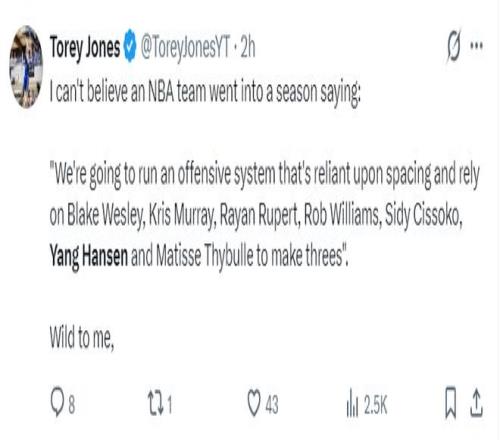 NBA記者特雷-瓊斯,我簡直不理解有NBA球隊會說依靠韋斯利、克里斯穆雷、羅威、西索科、楊瀚森、塞布爾這樣的陣容來投三分球,這完全是瘋狂的說法。