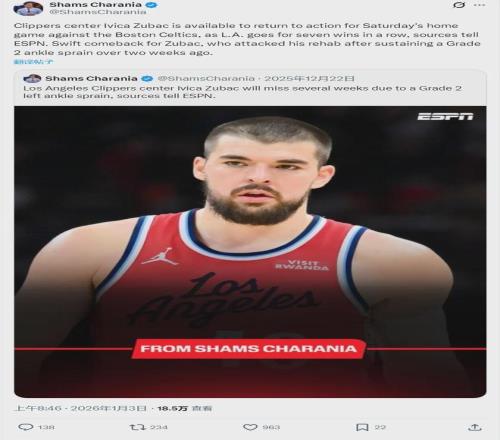 更加利好的是,快船要迎來祖巴茨的復(fù)出。